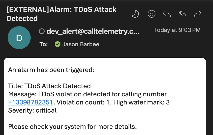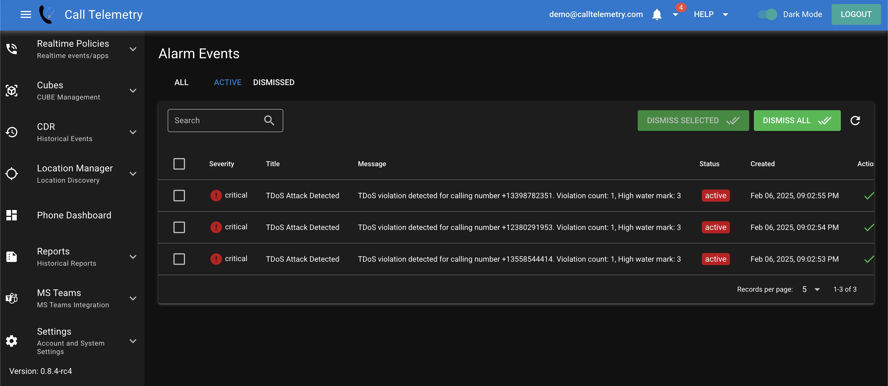 Administrators will receive email notifications when TDoS protection is triggered, providing real-time alerts for immediate response. Active and historical alarms are shown in the Dashboard